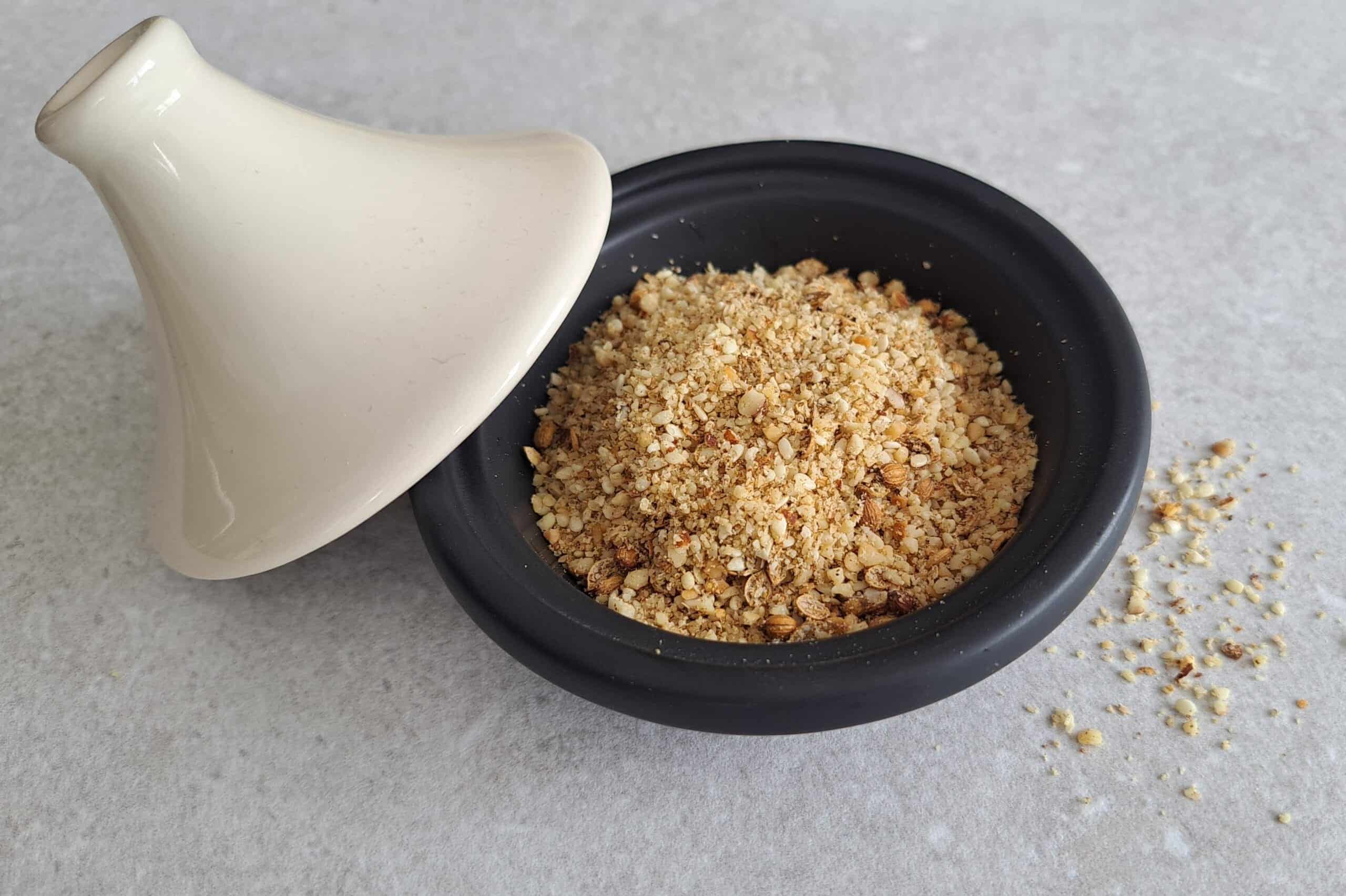 The dukkah will keep in a sealed jar in a dark cupboard for a few weeks.