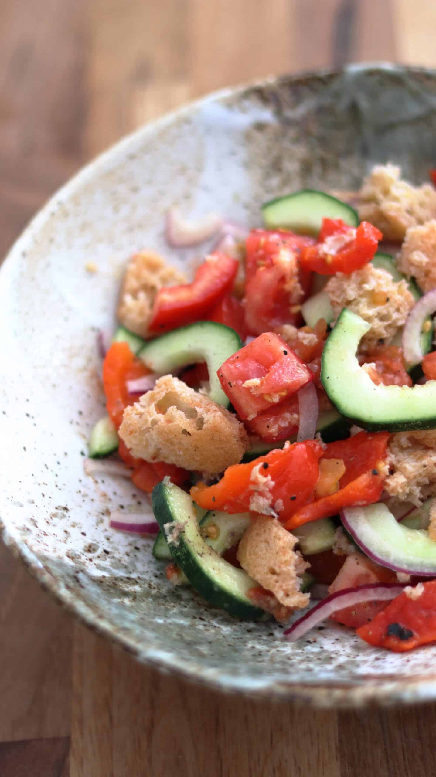The recipe for Panzanella salad can create a lot of debate. At the core, everyone is in agreement that it’s leftover stale bread and tomatoes. However, what you put in the bowl in addition to this can vary a lot. At the end of the day it comes down to preference and I’m sharing with you the version that is tried and tested in our household. Feel free to experiment and come up with your own twist to this Tuscan tomato dish.