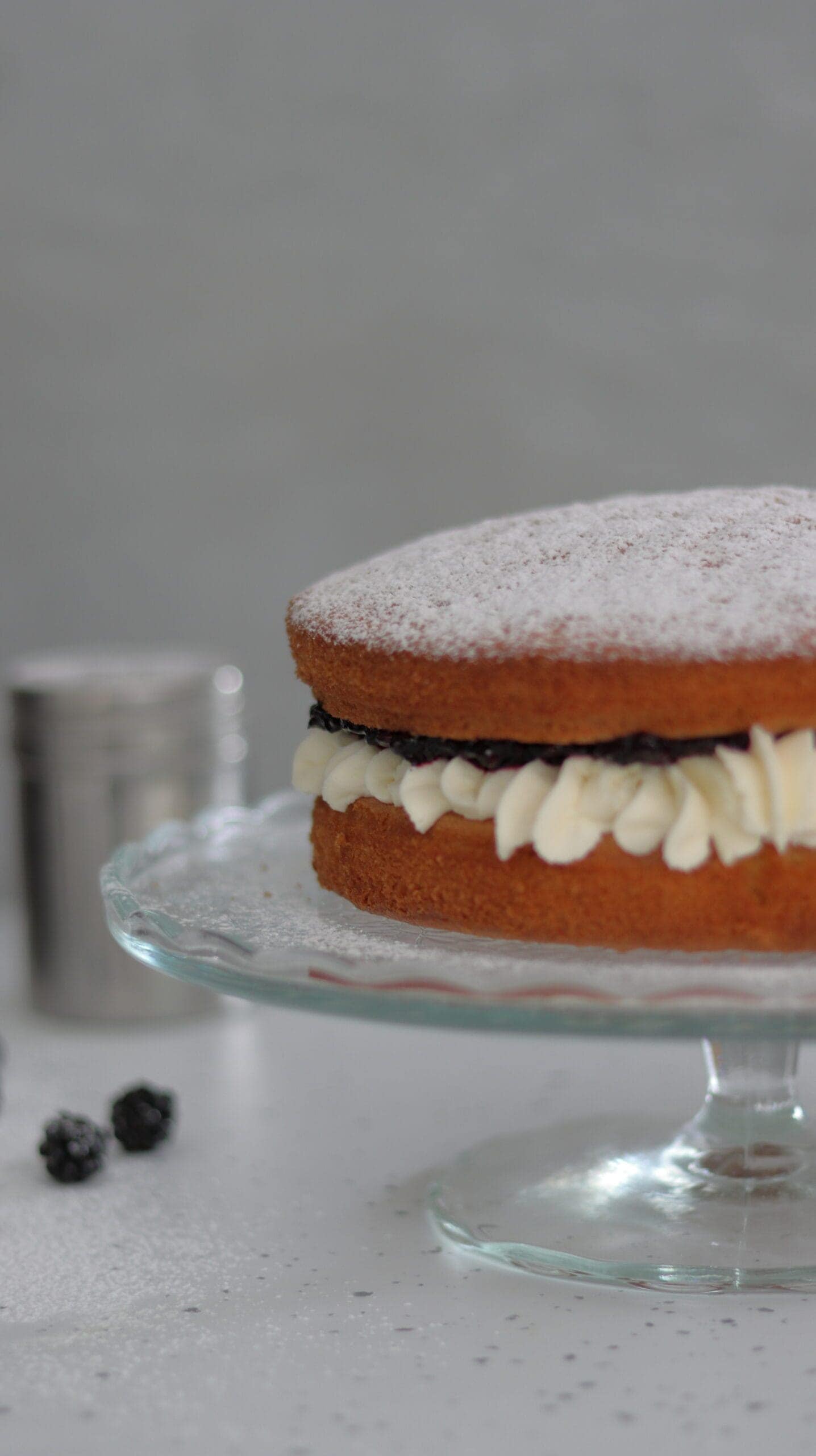 - When the sponges are completely cool, thinking about which sponge you wish to be your presentation side on top of the cake, pipe or spread the mascarpone cream icing onto the bottom sponge and the blackberry jam on the middle of the sponge that will be the top. Then sandwich the top sponge (with the blackberry jam) on top of the cream. Finally, take a small sieve or tea strainer, and dust the top with the icing sugar.