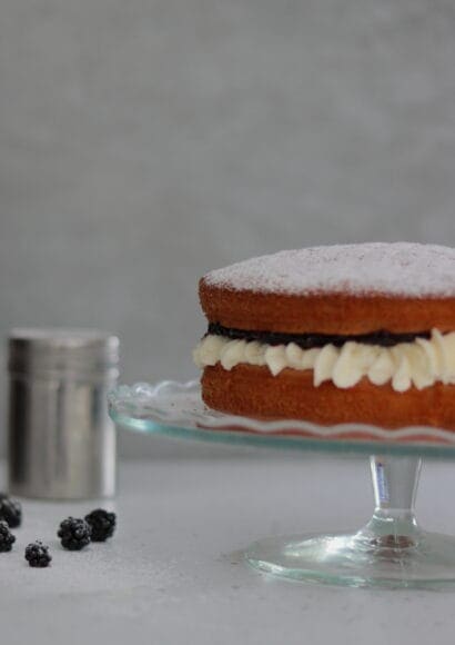 It may be a simple cake, but there is something about a light and airy Victoria Sponge that takes you on a trip down memory lane, and brings a smile to anyone who takes a bite. In this recipe, I’ve filled the sponge with a creamy, slightly sweetened, mascarpone and cream icing married with homemade blackberry jam to create a match made in heaven.